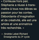 Stéphanie Bénéteau travaille avec les jeunes depuis plus de vingt ans, d'abord comme enseignante au niveau primaire, puis comme conteuse et animatrice d'ateliers. Sa formation académique et son expérience en éducation lui ont appris à donner des spectacles et des ateliers qui tiennent compte du niveau des jeunes et à offrir des activités attrayantes où tous sont actifs et impliqués.