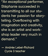 Stéphanie Bénéteau has been working with young people for more than twenty years, first as a primary school teacher and then as a storyteller and workshop leader. Her training and experience in education have taught her to gear her performances and workshops to the level of the students in each group, ensuring that everybody is active and engaged.
